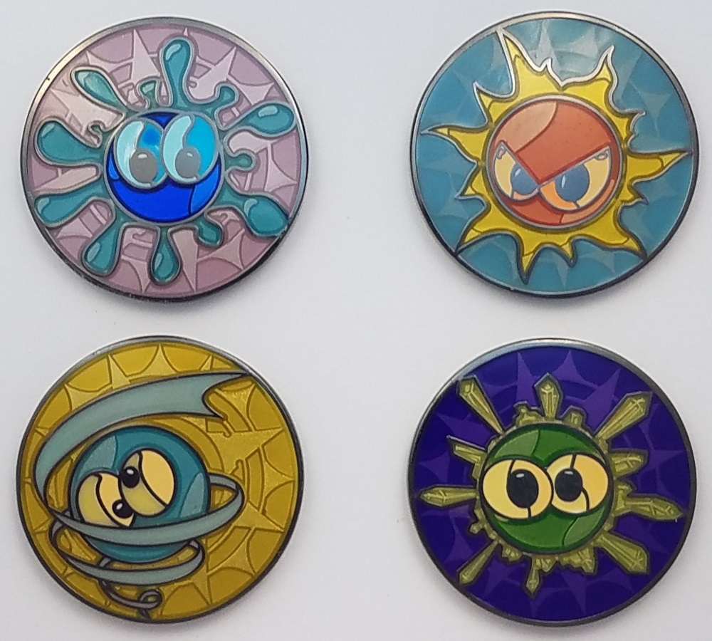 This set of four micro coins feature fun representations of fire, air, earth and water on the face with a colorful compass rose on the flip side.